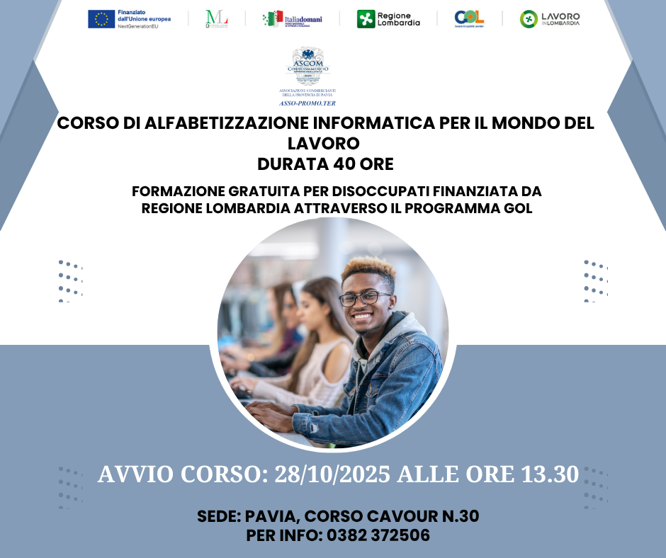 “Alfabetizzazione informatica per il mondo del lavoro” con il PROGRAMMA GOL (Garanzia Occupabilità Lavoratori) che prevede percorsi di accompagnamento al lavoro, di aggiornamento o riqualificazione professionale per favorire le transizioni occupazionali e migliorare l’occupabilità dei lavoratori.
