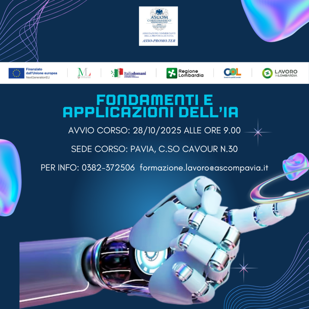 “Fondamenti e Applicazioni dell’Intelligenza artificiale” della durata di 16 ore con il PROGRAMMA GOL (Garanzia Occupabilità Lavoratori) che prevede percorsi di accompagnamento al lavoro, di aggiornamento o riqualificazione professionale per favorire le transizioni occupazionali e migliorare l’occupabilità dei lavoratori.